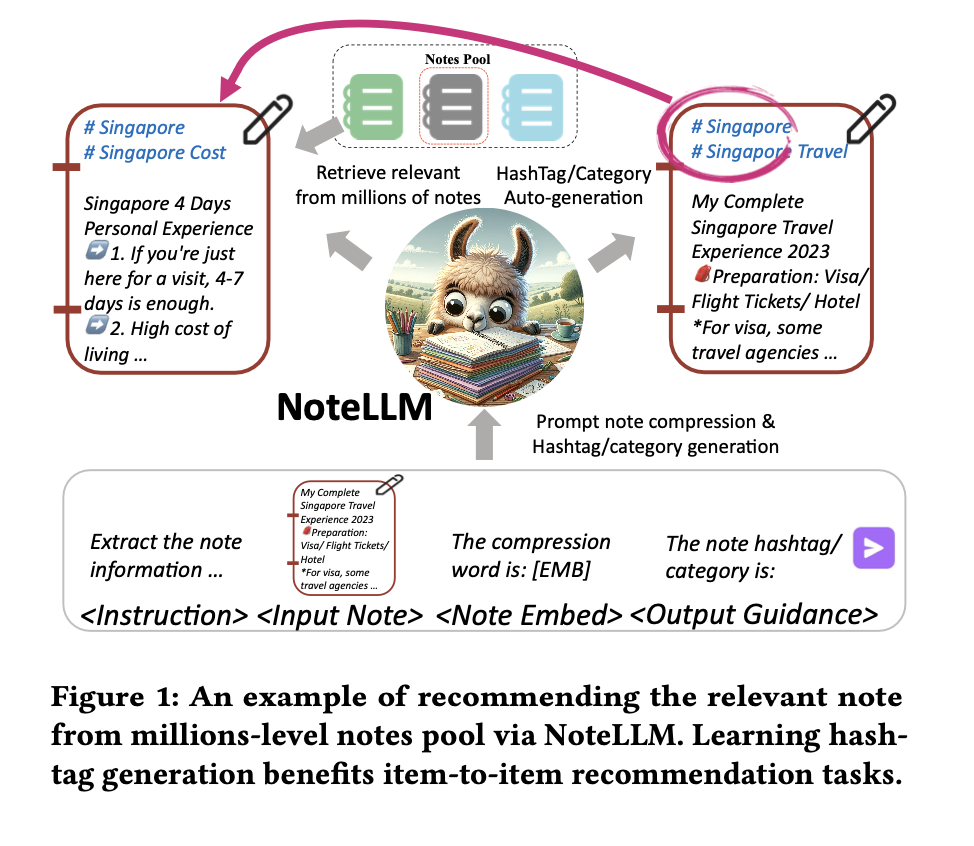 人们乐于在在线社区中分享包含个人体验的"笔记",因此推荐符合用户兴趣的笔记已成为一项关键任务。现有在线方法仅将笔记输入基于BERT的模型生成嵌入以评估相似性,但可能未充分利用某些重要线索,例如代表笔记核心概念的标签(hashtags)或分类。实际上,学习生成标签/分类可增强笔记嵌入,两者均将关键信息压缩为有限内容。此外,大型语言模型(LLMs)在自然语言理解上显著优于BERT,引入LLMs至笔记推荐具有广阔前景。