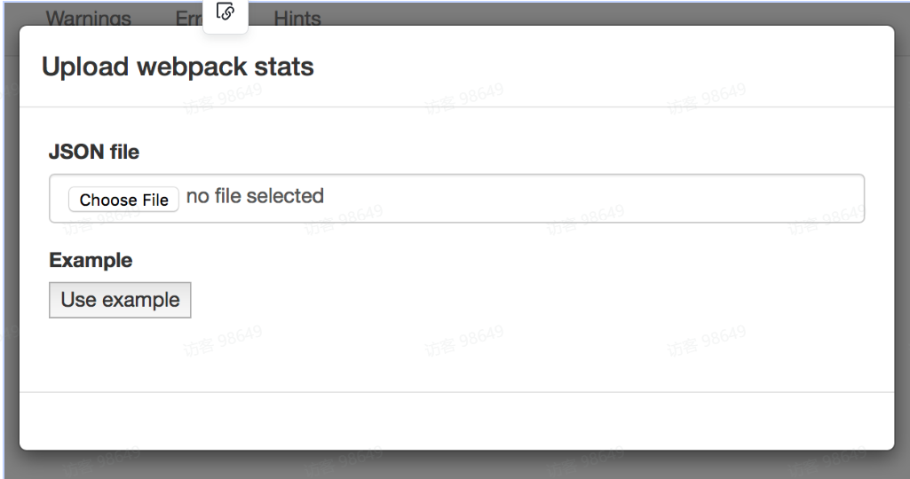 打开 Webpack Analyse 链接的网页后,你就会看到一个弹窗提示你上传 JSON 文件,也就是需要上传上面讲到的 stats.json 文件,如图: