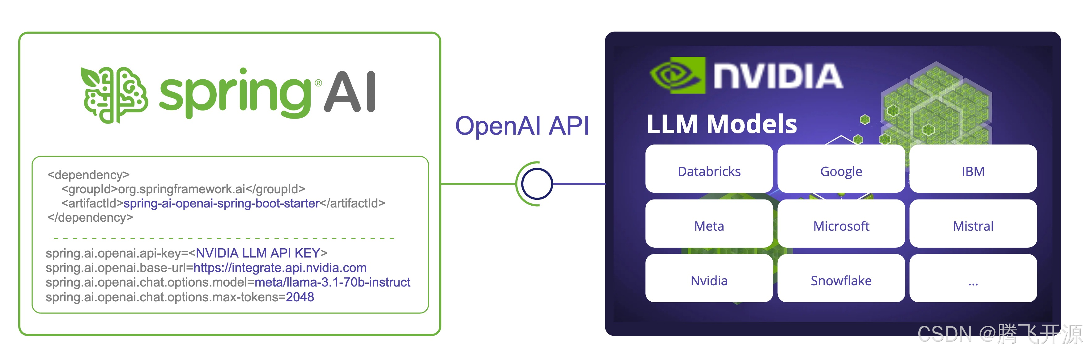 Spring AI 通过复用现有的 OpenAI 客户端与 NVIDIA LLM API 集成。为此,您需要将基础 URL 设置为 https://integrate.api.nvidia.com,选择 NVIDIA 提供的一个 LLM 模型,并获取其 API 密钥。