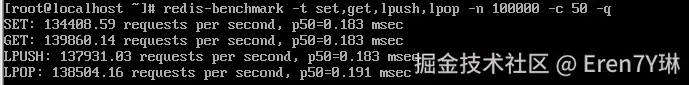 redis-benchmark -t set,get,lpush,lpop -n 100000 -c 50 -q