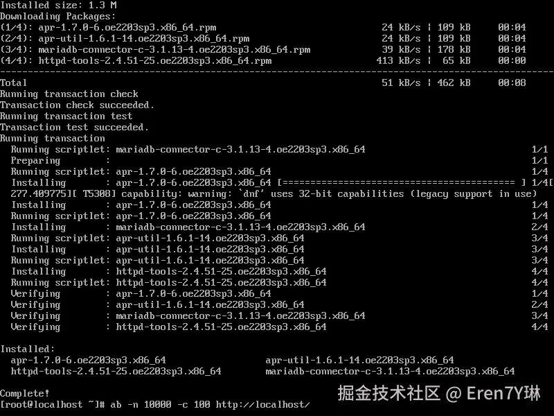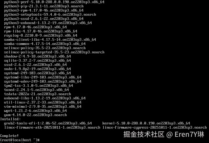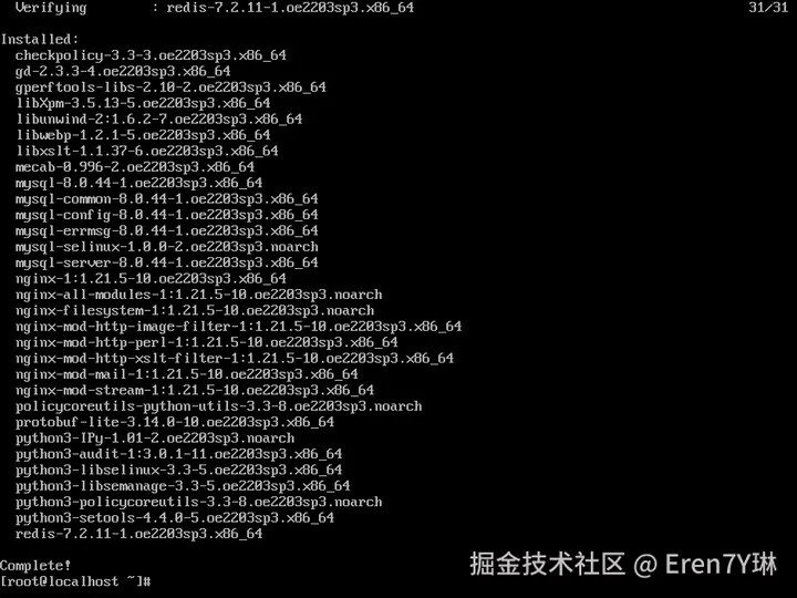 安装过程实时监控显示,所有软件包从openEuler官方仓库顺利下载,依赖解析完整,无冲突报错,体现了软件仓库的响应速度和组件完整性。