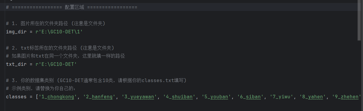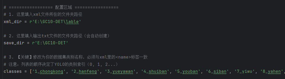 明确你的数据集包含哪些类别(Classes),并按顺序填入代码中。