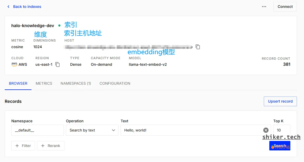这里有一个关键点:如果创建 Index 时 embedding 选择了 OpenAI 或 Custom,你将无法使用 Pinecone 的免费 embedding 服务。