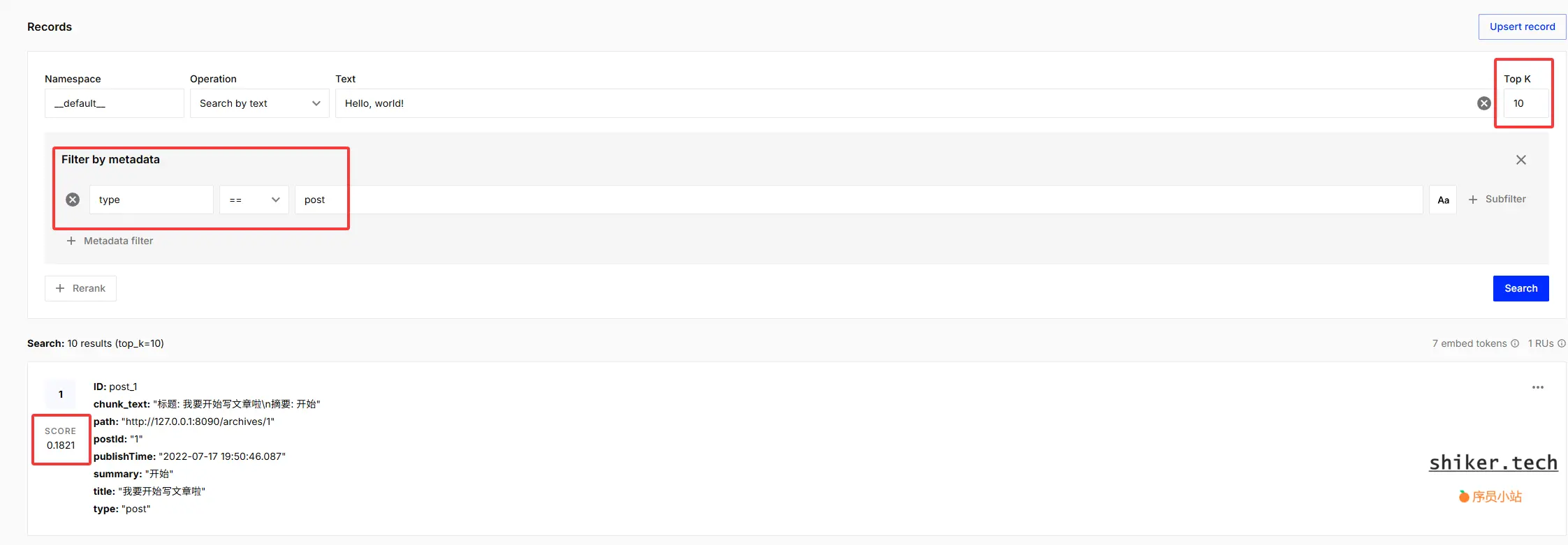 - 先写入几十条数据:建议使用本地或预发布环境,通过脚本或简单的循环写入,将文章、图片描述、附件说明等多类型数据各准备一些。这样可以提前验证 metadata 结构、向量维度、编码、请求体格式是否正确。