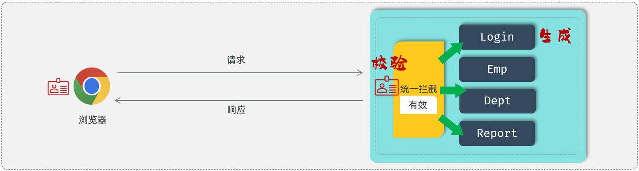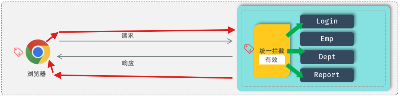 在浏览器发起请求 时,需要在服务端进行统一拦截 ,拦截后进行登录校验。