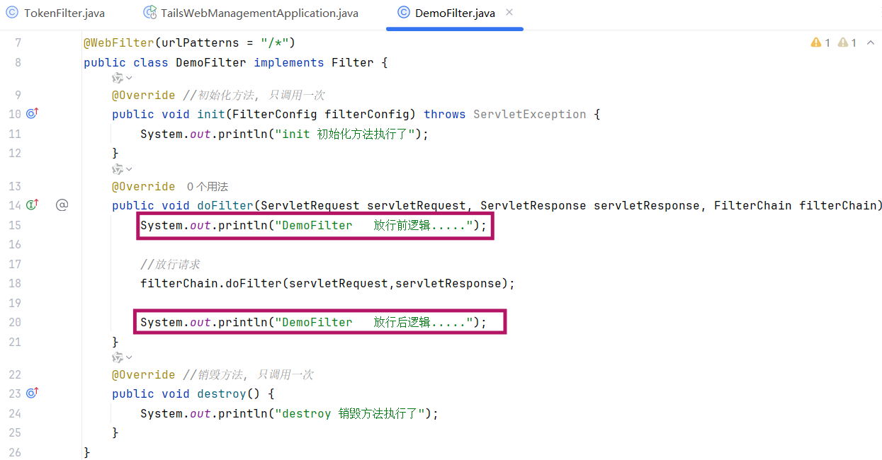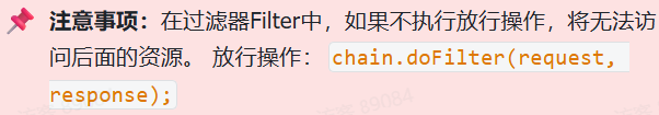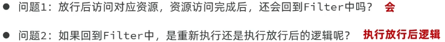 在放行后访问完 web 资源之后还会回到过滤器当中,回到过滤器之后如有需求还可以执行放行之后的逻辑,放行之后的逻辑我们写在doFilter()这行代码之后。