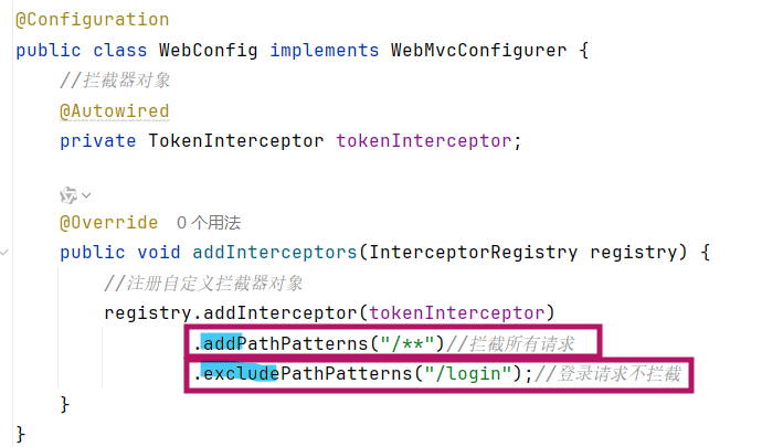 2.注册配置拦截器(将拦截器注册到 Spring 容器,并配置拦截规则)