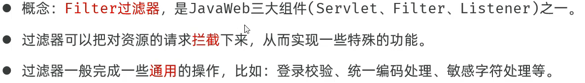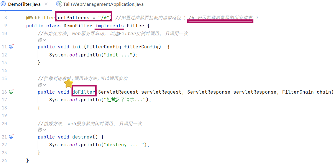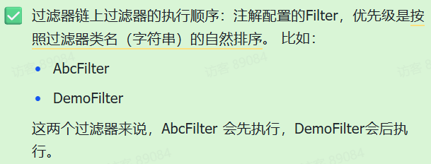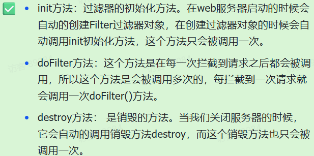 | 生命周期方法 | init(初始化)、doFilter(拦截逻辑)、destroy(销毁) |