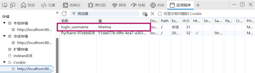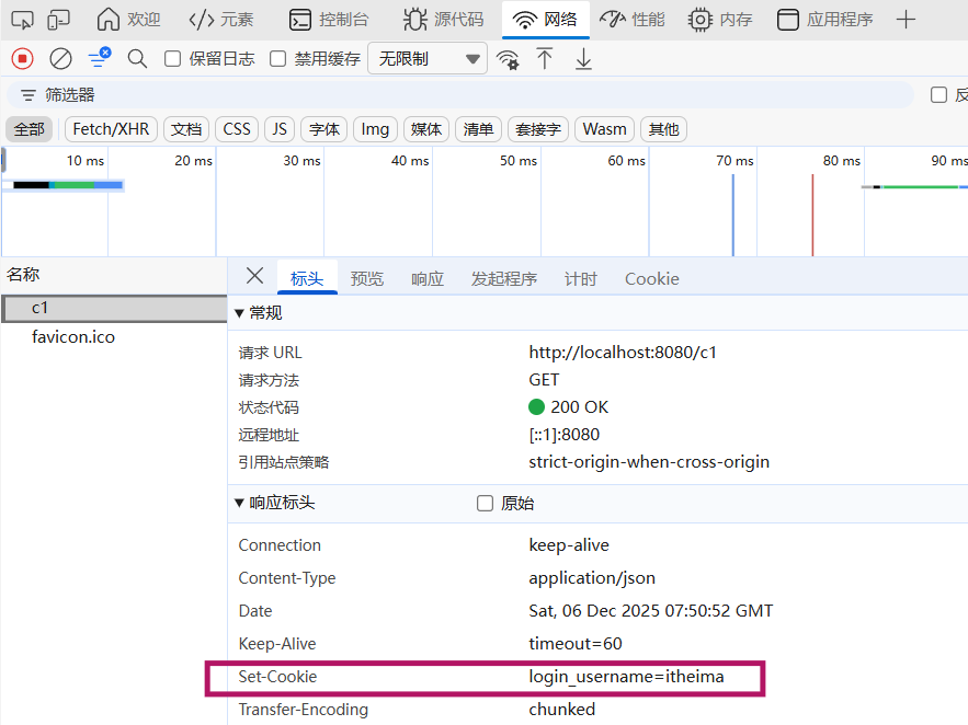 我们可以看到,设置的cookie,通过**响应头Set-Cookie**响应给浏览器,并且浏览器会将Cookie,存储在浏览器端。