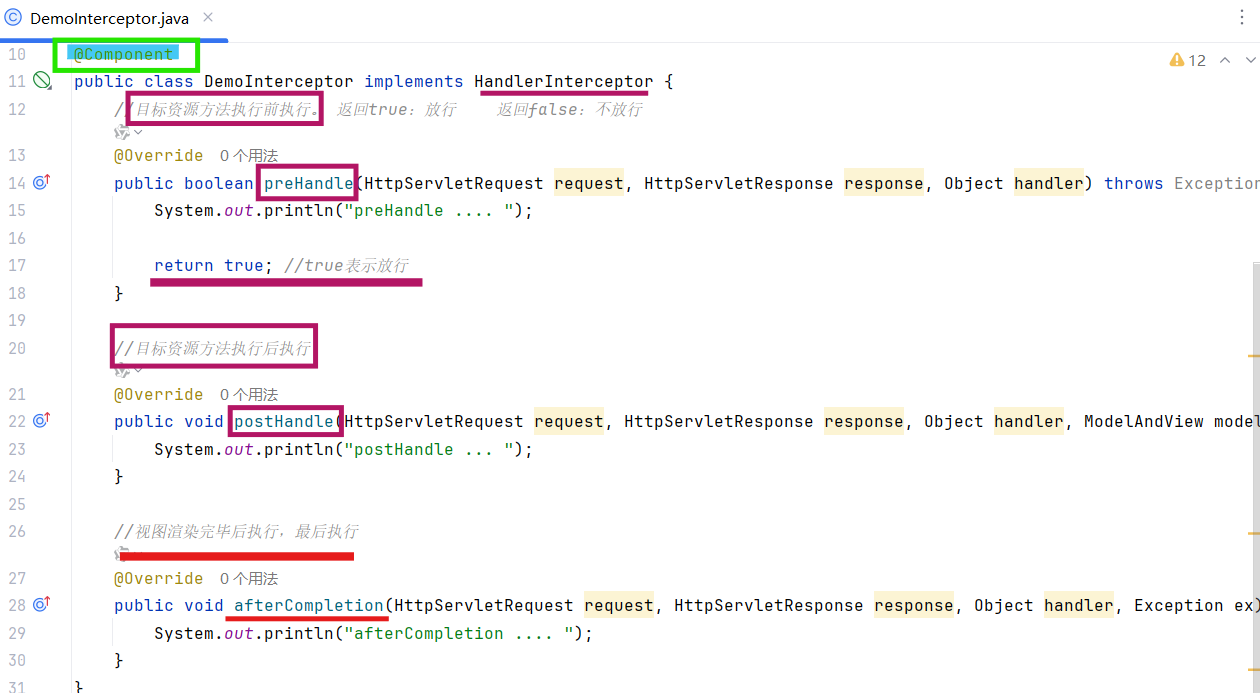 preHandle:目标接口方法执行前 触发(如校验 Token、权限),返回**true则放行** 请求,false则拦截;postHandle:目标接口方法执行后、视图渲染前触发(如修改响应数据);afterCompletion:视图渲染完成后触发(如资源清理)。前后端分离 很少用到。