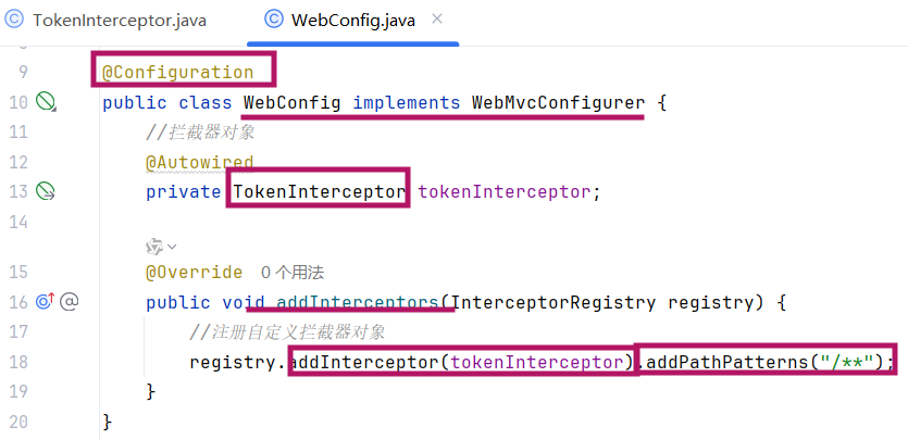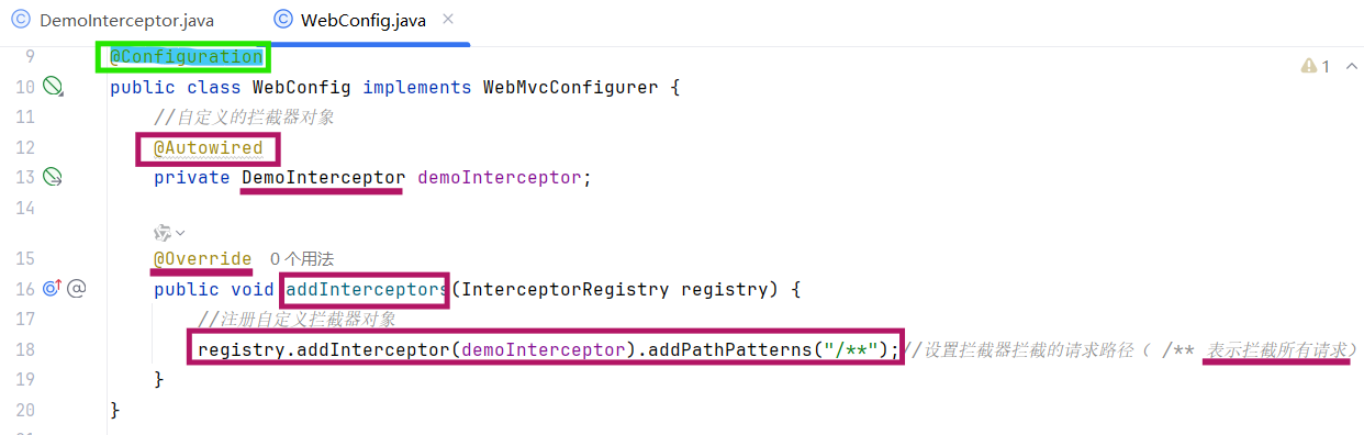 @Configuration:标记为配置类;@Autowired:注入自定义拦截器DemoInterceptor;addInterceptors:注册拦截器,并通过addPathPatterns("/**")设置 "拦截所有请求"。