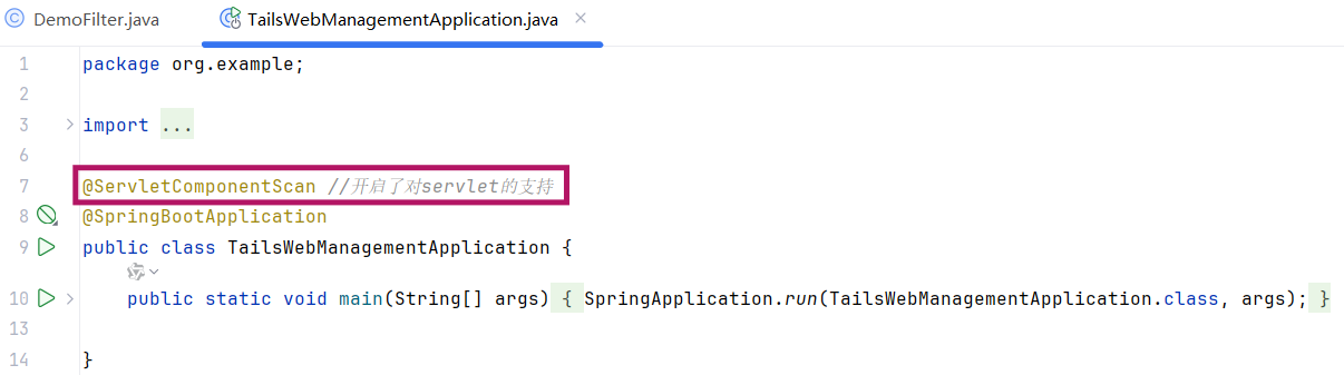 第2步,配置过滤器:++Filter类++ 上加 @WebFilter 注解,配置拦截资源的路径。++引导类++ 上加 @ServletComponentScan 开启Servlet组件支持。
