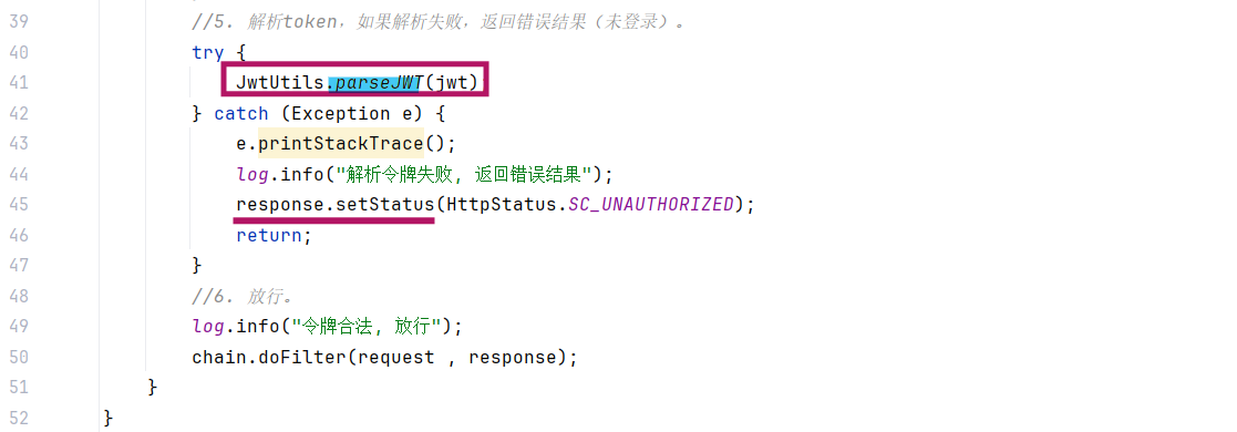 对于校验令牌的这一块操作,我们使用登录校验的过滤器,在过滤器当中来校验令牌的有效性。如果令牌是无效的,就响应一个错误的信息,也不会再去放行访问对应的资源了。如果令牌存在,并且它是有效的,此时就会放行去访问对应的web资源,执行相应的业务操作。