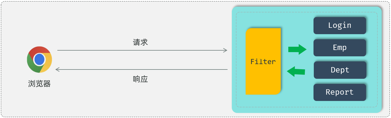 当我们打开浏览器来访问部署在web服务器当中的web应用时,此时我们所定义的++过滤器会拦截++ 到这次请求。拦截到这次请求之后,它会先执行++放行前++ 的逻辑,然后再执行++放行++ 操作。而由于我们当前是基于springboot开发的,所以放行之后是++进入到了spring的环境++当中,也就是要来访问我们所定义的controller当中的接口方法。