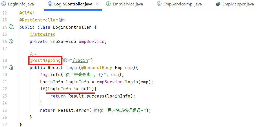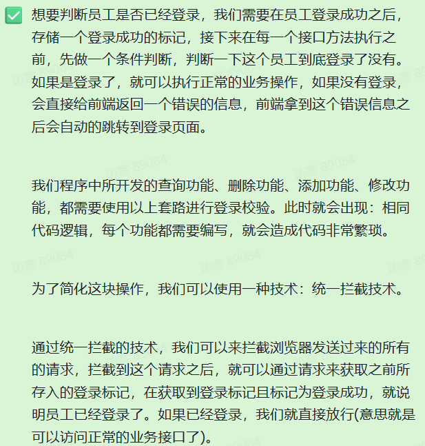 为什么会出现这个问题?因为针对于我们当前所开发的部门管理、员工管理以及文件上传等相关接口 来说,我们在服务器端并没有做任何的判断 ,没有去判断用户是否登录了。所以无论用户是否登录,都可以访问部门管理以及员工管理的相关数据。而我们要想解决这个问题,我们就需要完成一步非常重要的操作:登录校验。