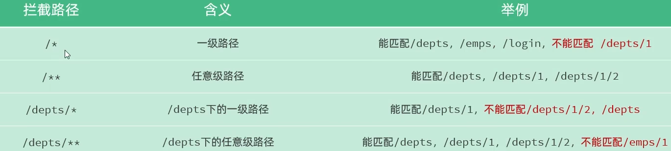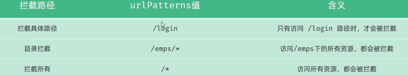 通过**addPathPatterns("要拦截路径")**方法,就可以指定要拦截哪些资源。