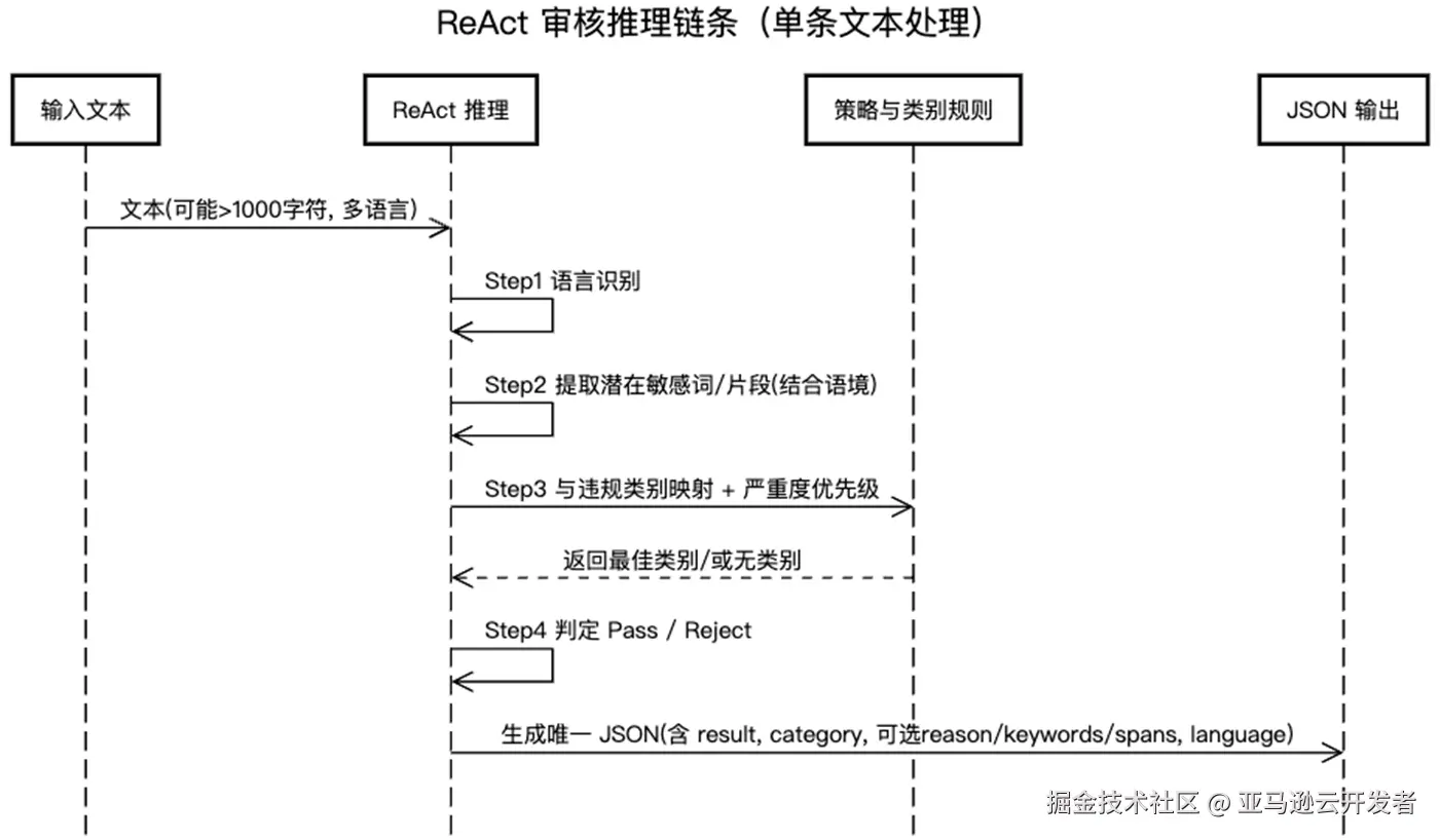 prompt_template.format(text=...)注入样本正文。 - 建议 :模板内统一约束唯一 JSON 输出,便于解析;输出前置 ReAct 步骤(语言识别、关键词提取、类别匹配、最终判定)。