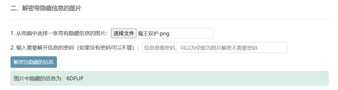附件是一个图片一个压缩包,然后没想到是图片隐写术解密,这个考点之前只见过一次,这次吸取教训吧,这里使用在线图片添加/解密隐藏信息(隐写术)工具 - 站长辅助工具 - 脚本之家在线工具