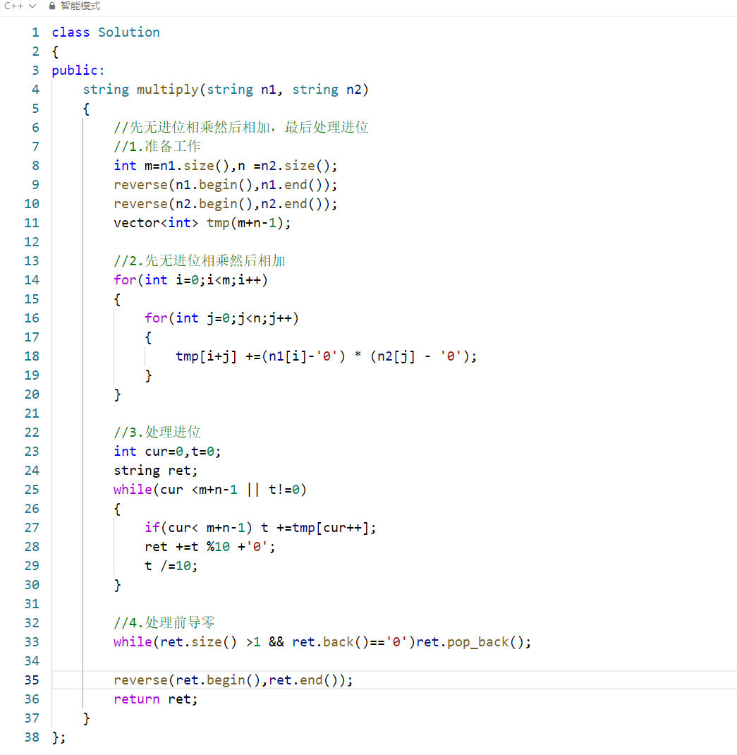 该算法是字符串乘法的经典实现,核心是 "无进位累加 + 统一进位",避免了逐位处理进位的繁琐,逻辑清晰且效率较高。