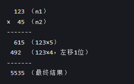 - 例如:n1 的第 i 位(对应 10^i 位) × n2 的第 j 位(对应 10^j 位)= 结果的 10^(i+j) 位,因此累加到
