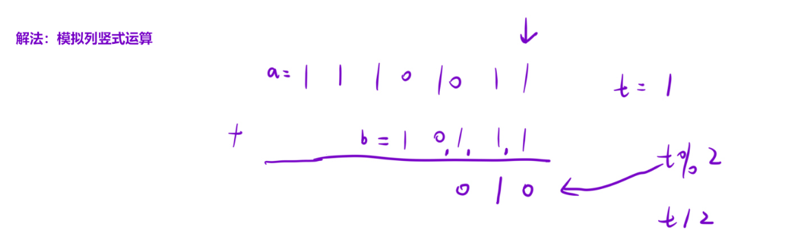 t同时存储 "当前位总和 + 进位",初始为 0(无初始进位)。