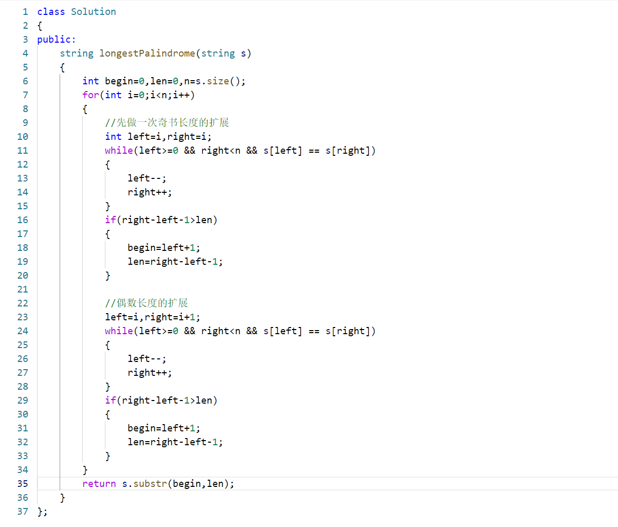 该代码采用经典的中心扩展法求解最长回文子串,核心思路是:回文子串的中心有两种形式(奇数长度以单个字符为中心、偶数长度以两个相邻字符为中心),遍历字符串的每个位置,分别以该位置为「奇数中心」、该位置与下一个位置为「偶数中心」向左右扩展,记录每次扩展得到的最长回文子串的起始位置和长度,最终截取结果。
