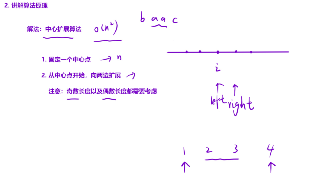 - 首先处理奇数长度的回文 :将左右指针