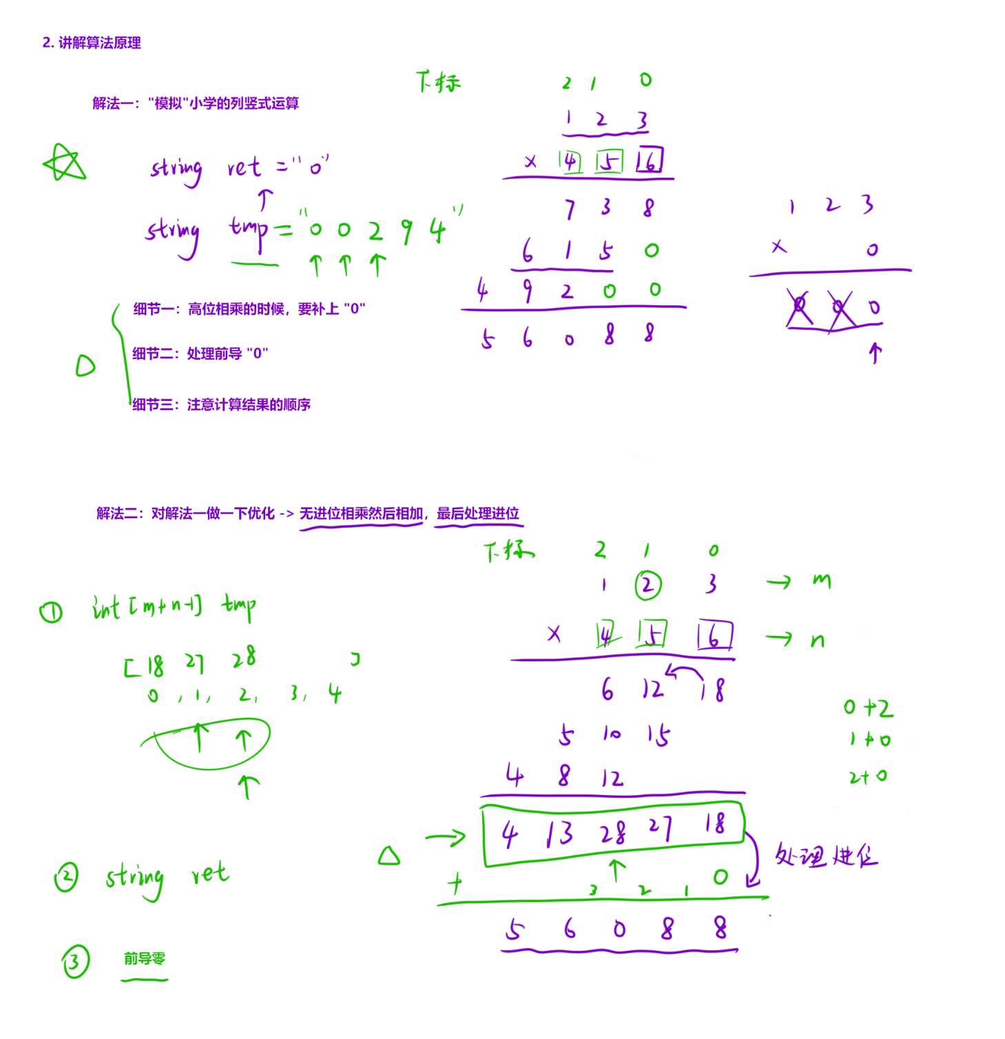 n1[i] × n2[j]的结果累加到tmp[i+j](因为个位 × 个位 = 个位,个位 × 十位 = 十位,对应索引和); - 统一处理进位:遍历累加后的数组,将每一位的余数保留、商进位;