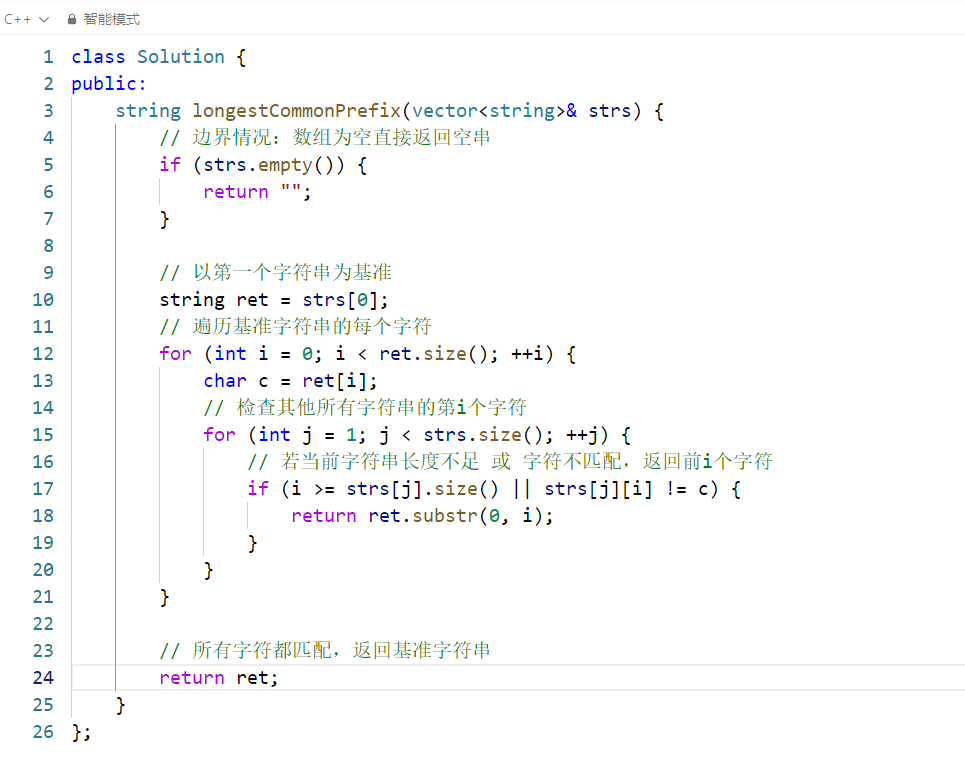 i >= strs[j].size():当前字符串strs[j]的长度小于i+1(比如基准字符串是"flower"(长度 6),而strs[j]是"flow"(长度 4),当i=4时,strs[j]没有第 4 个字符),说明该字符串的长度已不足以匹配基准字符串的第i位,公共前缀只能到第i位之前。strs[j][i] != c:当前字符串strs[j]的第i个字符和基准字符c不匹配(比如基准字符是'o'(i=2),而strs[j]是"flight",其第 2 位是'i'),说明公共前缀到第i位之前截止。