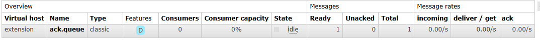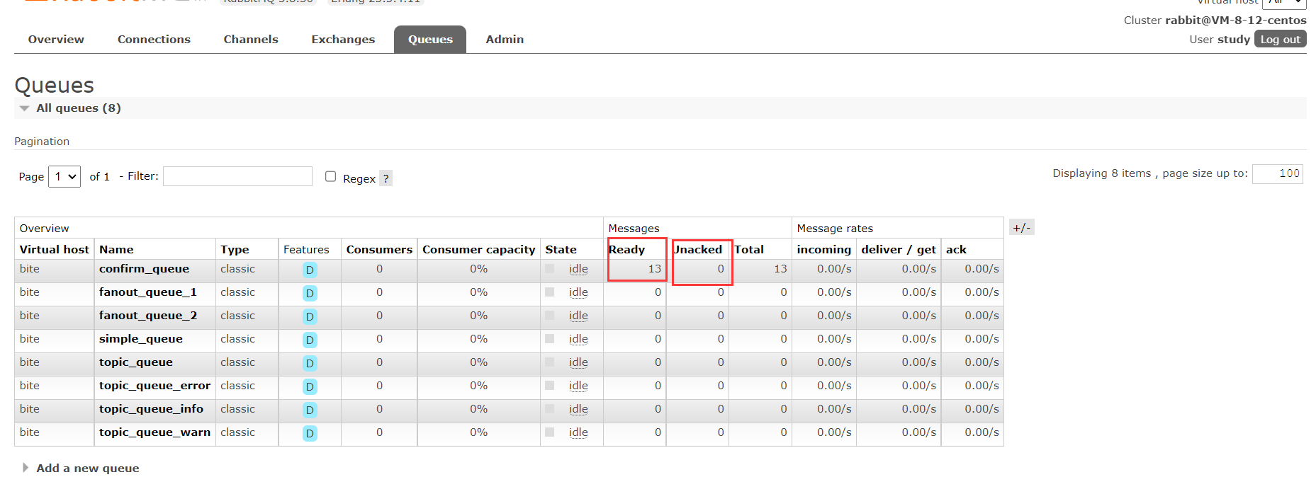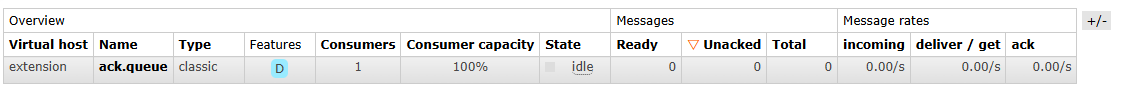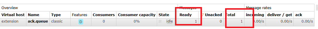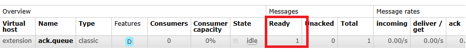 从RabbitMQ的管理平台上,也可以看到当前队列中的Ready和Unacked状态的消息数。