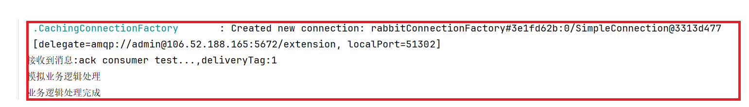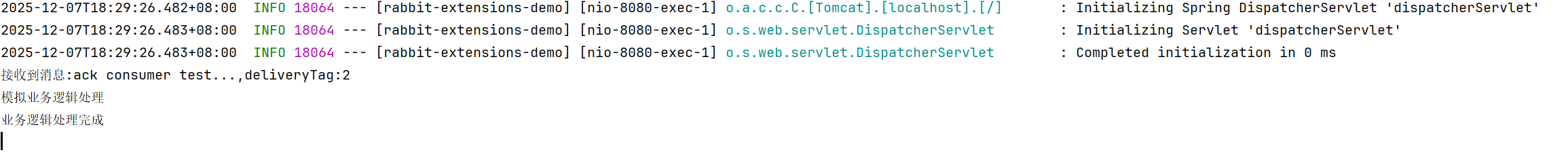 可以看到消息被正常处理了,这里的deliveryTag=2,是因为我们刚才测试auto的那条消息因为重发一直在队列中,成为重启后当前channel发给消费者的第一条消息。