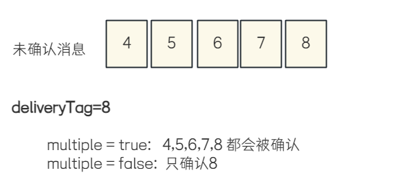 (2)multiple:是否批量确认。在某些情况下,为了减少网络流量,可以对一系列连续的deliveryTag进行批量确认。值为true则会一次性ack所有小于或等于指定deliveryTag的消息。值为false,则只确认当前指定的deliveryTag的消息。