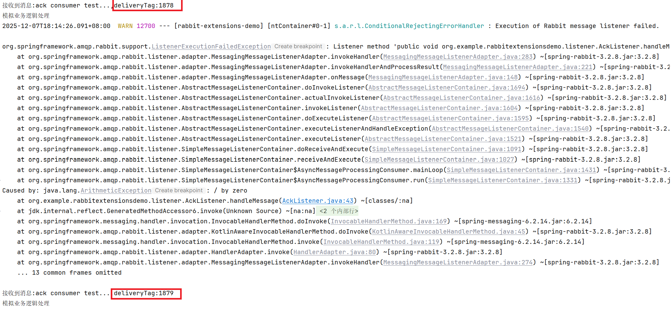 可以看到控制台打印出异常,并且业务逻辑也没有正确执行,但是队列中的消息仍然消失了:
