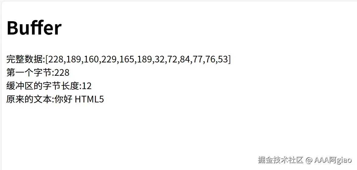 console.log(myBuffer); // 输出 Uint8Array(12) [228, 189, 160, 229, 165, 189, 32, 72, 84, 77, 76, 53]