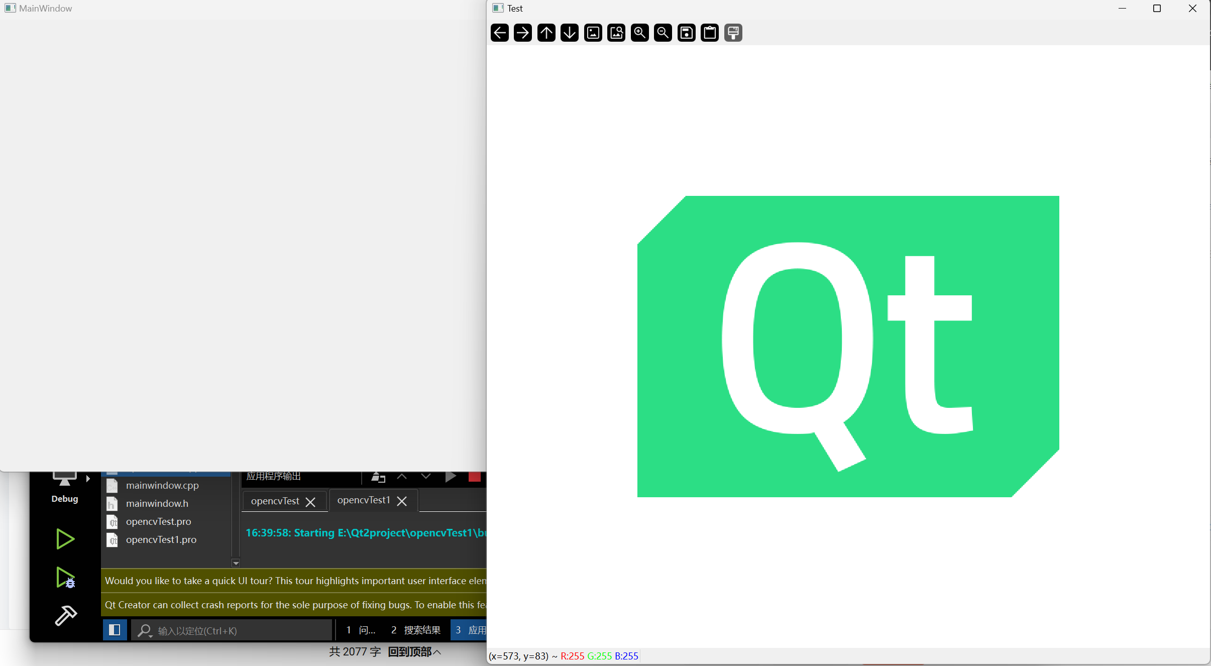 这个时候构建并运行qt程序,看到显示一个qt窗口和一个Opencv窗口说明成功配置