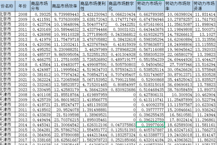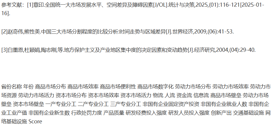 该数据集系统测算了2008至2023年全国省级层面的统一大市场发展水平,涵盖商品、劳动力、资本三大市场的多维指标,包括市场分布、效率、便利性、数字化程度等32项具体字段。例如,商品市场效率通过交易成本与流通速度量化,劳动力市场活力则结合就业流动性与技能匹配度评估,而资本市场壁垒则反映区域融资约束程度。数据还纳入物流、人流、资金流等要素流动指标,以及研发投入、创新产出等反映市场发展环境的变量,通过熵值法构建综合评分(Score),为量化分析提供统一基准。