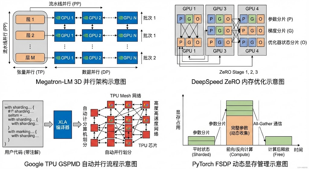 小结: 总的来说,Megatron-LM 相比其他框架更专注于利用GPU算力极限 来训练最大规模的模型,在NVIDIA硬件上表现卓越;DeepSpeed 则以通用性和内存优化 见长,使得大模型训练门槛降低,并在分布式优化和易用性上领先;TPU GSPMD 代表了编译器自动并行 的方向,在谷歌内部大模型上效果突出,但封闭性较强;FairScale(FSDP)提供了与ZeRO类似的开源替代方案 ,已经融入PyTorch生态,在需要纯数据并行扩展模型时非常有效。随着框架间互相融合(如Megatron与DeepSpeed结合、PyTorch集成FSDP等),未来大模型训练将更趋向于融合多种并行技术的综合方案,开发者可根据硬件平台和需求选择合适的工具组合。