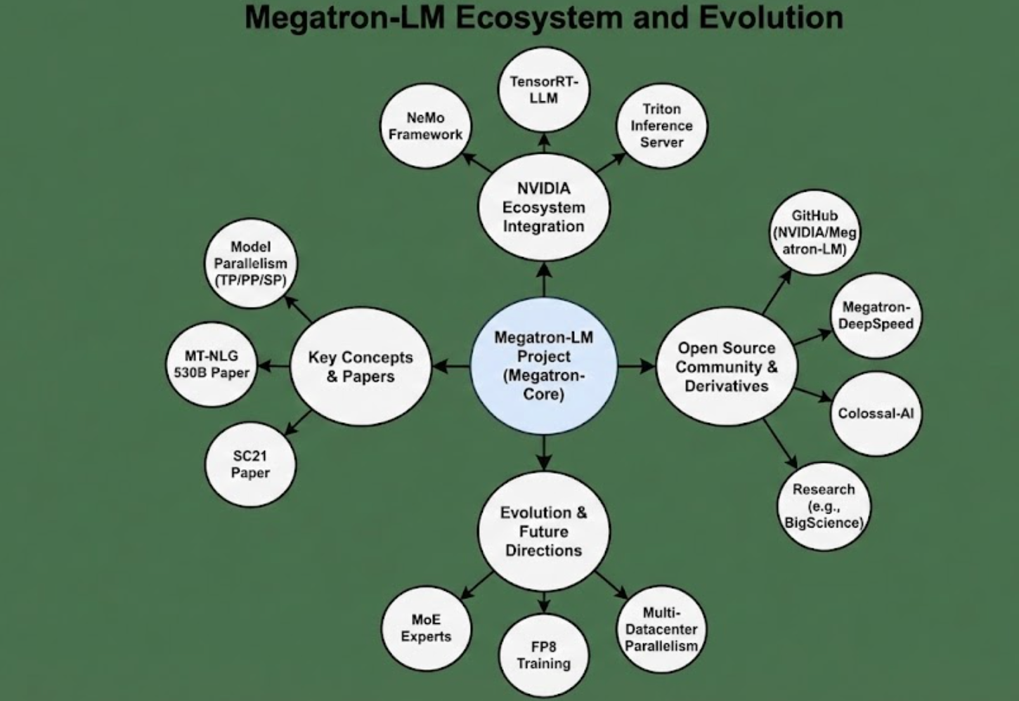 总结: Megatron-LM 从诞生到现在,已经成长为一个涵盖训练算法、工程实现到部署支持 的完备大模型框架。在 NVIDIA 的持续投入和开源社区的参与下,Megatron-LM 不断吸纳最新的研究成果(如优化器、混合精度、新并行算法),保持行业领先。同时,它与其他框架的竞争合作也推动了整个生态的进步------当下训练超大语言模型,往往是 Megatron-LM、DeepSpeed、FSDP、XLA 等"你中有我"的综合方案,共同克服计算和内存壁垒。站在2025年的视角,Megatron-LM 已不仅仅是一个代码库,而代表着大规模AI模型训练的经验结晶和标准基线。它的架构理念将继续影响未来的框架和硬件设计;而其开源精神也将帮助更多团队打造属于自己的"巨型模型"。