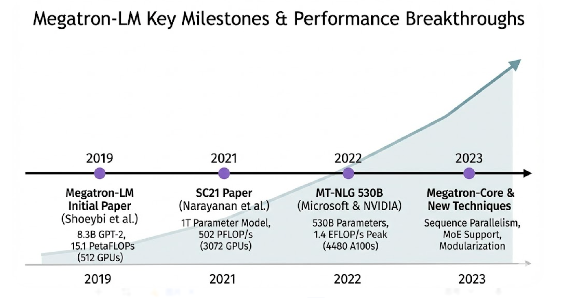 Megatron-LM 自2019年发布以来,在多篇重要论文中展示了其卓越的性能和规模突破。以下梳理关键论文及报告的指标: