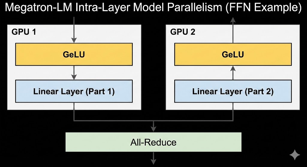 核心设计理念: Megatron-LM 的关键在于 "层内模型并行" (intra-layer model parallelism)。具体做法是将 Transformer 每层内部的计算拆分到多个 GPU 上并行执行,从而突破单 GPU 内存限制。例如,对于 Transformer 中的多层感知机(MLP)部分,Megatron-LM将第一层全连接权重矩阵按列拆分到不同 GPU,上一个非线性(如 GeLU)可以在各 GPU 上独立计算,第二层全连接则按行拆分并在汇聚输出前进行一次全规约(all-reduce)通信。类似地,自注意力层的 Query/Key/Value 投影按注意力头拆分到各 GPU,每个 GPU 只计算部分头的注意力,随后再对注意力输出的投影结果按行划分并行,最后通过全规约合并结果。这种设计使得各 GPU 无需在非线性激活前就频繁同步,只需在层输出时进行少量全规约,大幅减少了跨设备通信开销。