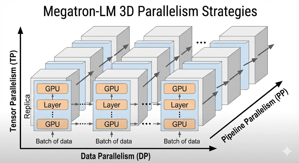 | Megatron-LM (NVIDIA) | 张量并行 + 流水线并行 + 数据并行(3D);有分布式优化器(类似ZeRO-2);支持序列并行等新技术 | 在 NVIDIA GPU 上验证至 万亿级模型训练; 8卡张量并行弱扩展效率~79.6%;1兆参数模型3072 GPU上达 52% 理论峰值效率 | 针对Transformer架构高度优化,需要按框架提供方式编写模型;提供现成脚本和配置,对底层硬件要求高(需要高速GPU互联) | NVIDIA 主导开源(GitHub★14k+),研究社区采用用于最前沿模型;与 NeMo、TensorRT 等深度集成 |