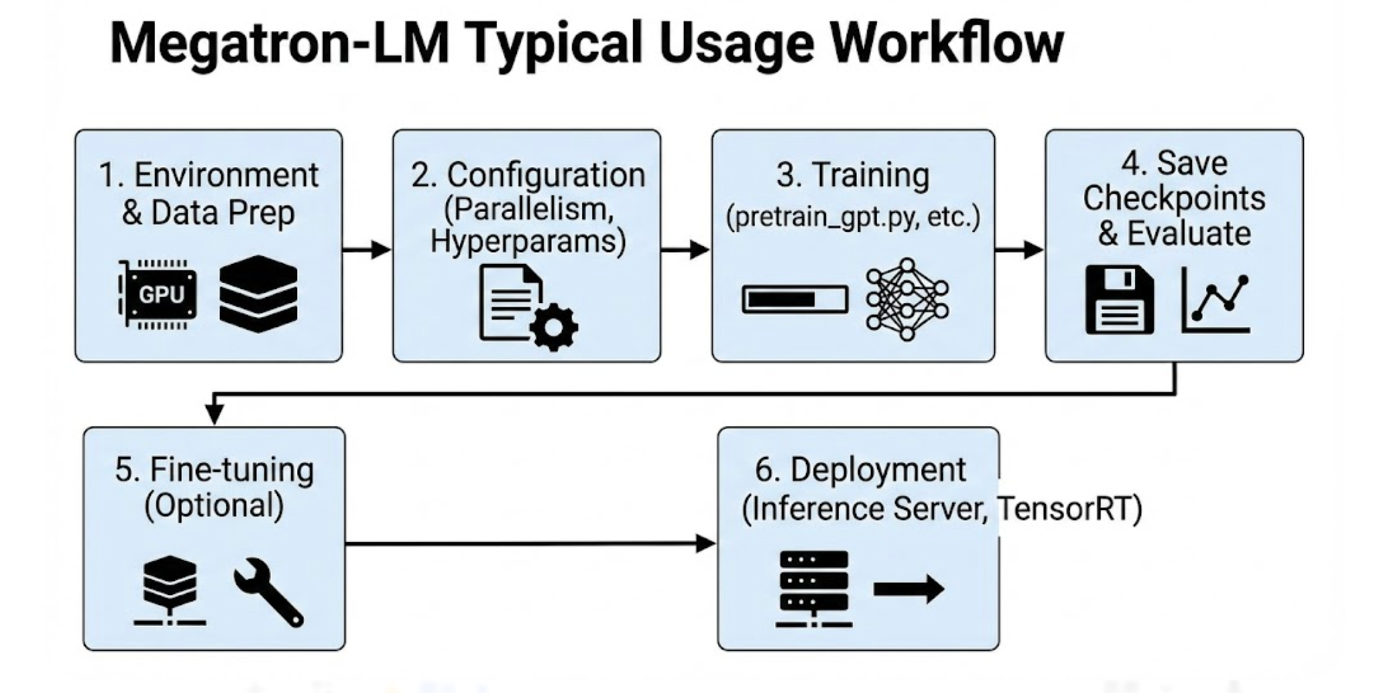 Megatron-LM 提供了一套完整的训练、微调和推理部署流程。典型使用涵盖以下几个步骤和注意事项:
