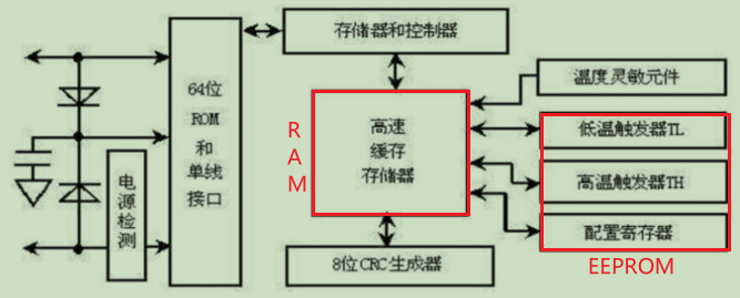 DS18B20 温度传感器的内部存储器包括一个高速的暂存器 RAM 和一个非易失性的可电擦除的 EEPROM(存放高温存储器TH、低温存储器TL、配置寄存器)