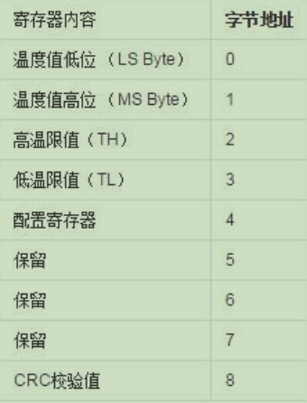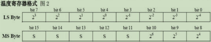 当温度转换命令(44H)发布后,经转换所得的温度值以二字节补码形式存放在高速缓存存储器的第 0(低字节(LS Byte)) 、1(高字节(MS Byte))个字节,即低字节存低 8 位,高字节存高 8 位