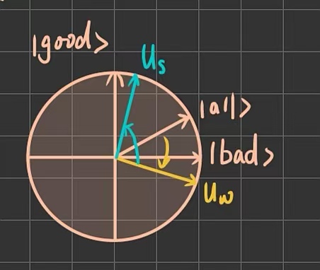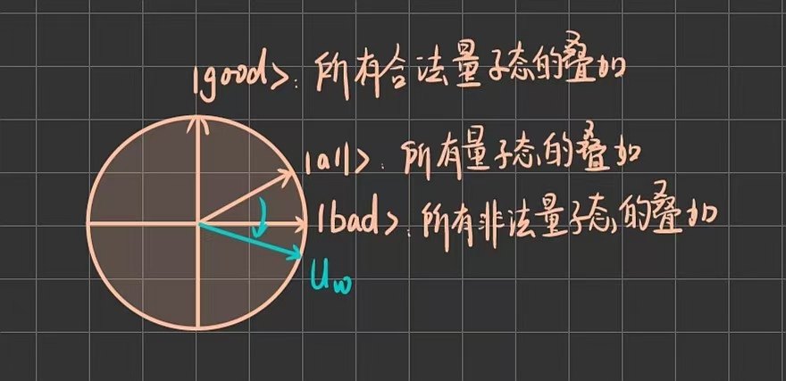 在几何上,可以想象一个二维平面,横轴代表所有非目标态的均匀叠加,纵轴代表目标态,该操作就是将状态向量关于横轴进行反射。它只是识别与标记,不改变幅度,同时采用的相位翻转能为后续的干涉创造条件。