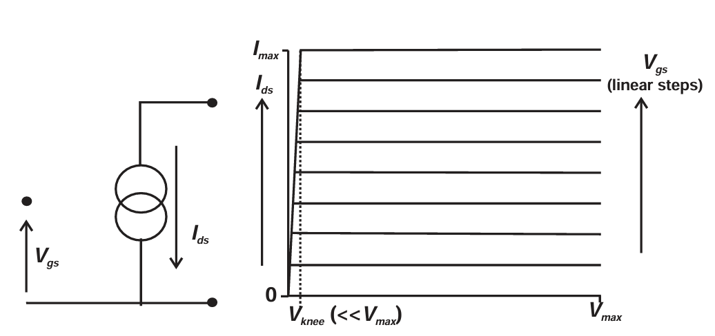 图2.5 Ideal strongly nonlinear device model. The "knee" turn-on region is neglected, and between 0 and Imax, the output current generator is linearly controlled by the input generator.