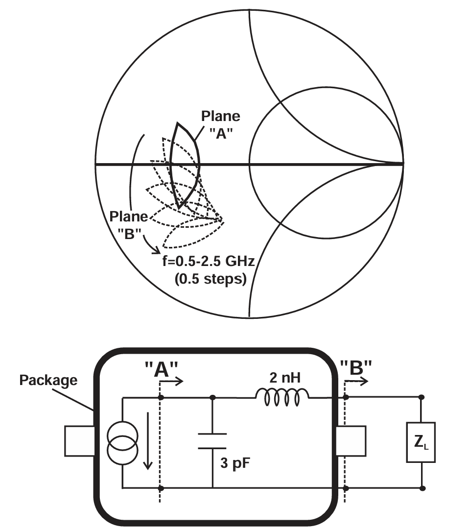 有人认为,通过将设计阻抗参考面转换到 A 面以消除频率依赖性是多此一举,因为器件与封装寄生参数可能并不准确。这在无线通信频段常见的窄带设计中特别适用。从原则上讲,单一频率的测量负载牵引数据集可以完成设计,但无法分析不同匹配网络随频率变化的性能,即便对窄带设计来说,这也是严重的限制。第 2.7 节的设计例子还将展示,理论负载牵引轮廓方法能进行一些有用的容差分析,而单一数据集无法做到。基于多种原因,了解封装寄生参数是良好的射频设计实践。可靠的器件厂商应能提供封装模型;在极端情况下,对于 2 GHz 以下的频率,简单封装模型也不难推导。一种方法是使用裸片的 S 参数(如果可作为独立产品提供),并将简单的封装模型拟合到封装器件的数据上。