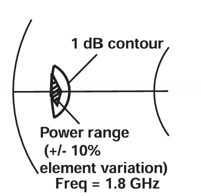 由于这是功率放大器,最重要的问题之一是:在输出端的两个关键匹配元件(电容和微带线)存在制造公差的情况下,输出功率会变化多少 。假设微带线宽度和基板介电常数能够严格控制,则电容值和微带线长度(即其具体定位)可能会变化达 ±10%。显然,公差越大,成本越低,产率越高。图 2.18 显示了当输出匹配电容 Cout 和微带线节长 λ/2 发生 ±10% 浮动时,A 面的阻抗变化。尽管该范围(阴影区域)在本例中仍然落在 1 dB 等高线内,但也能看出仍存在更好的设计中心点。能够同时观察频率和元件公差下的输出功率变化,是这种简单设计技术的一个强大且未被广泛认识的优点。