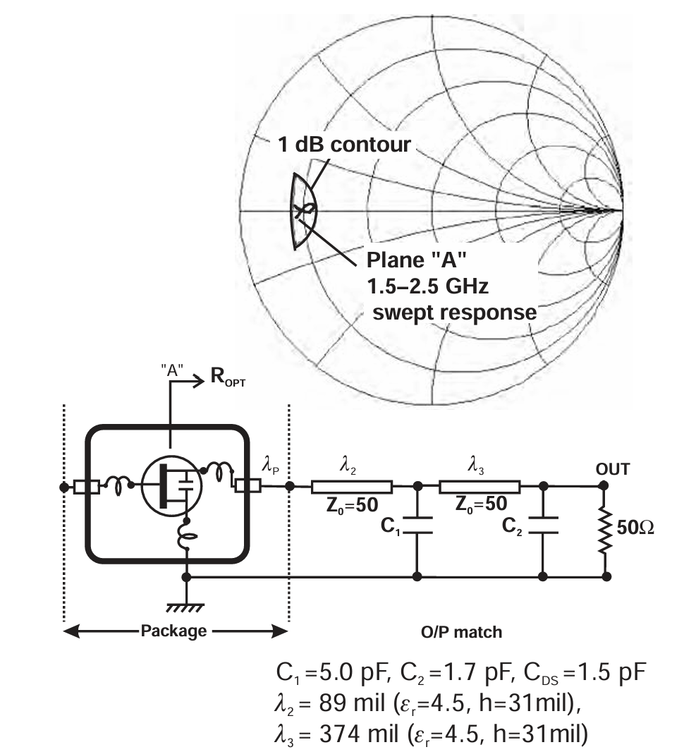现在将通过一个设计示例来展示使用前几节所发展的技术来设计 A 类放大器的基本步骤。如本章开头所述,这里的目标是将一个具有挑战性的非线性设计问题,转化为一个可以使用最基本设计工具解决的问题。该过程类似于经典的低噪声放大器设计,其中输入阻抗变换基于对最佳噪声匹配点以及噪声圆族的了解。而在这里,输出匹配网络完全基于负载线方法,以及由此得到的 Smith 圆图中 1 dB 负载牵引等高线的构建。输入匹配使用线性 S 参数来完成;设计基于一个接近但未超过可测得增益压缩点的功率水平,在该点 S 参数仍然接近低功率水平下的测量值。前面已经指出,在这一点获得的良好功率匹配很可能也接近于更高压缩程度下的最佳匹配,且无论如何,对于具有包络变化的信号来说,这代表了线性性能的良好折中。