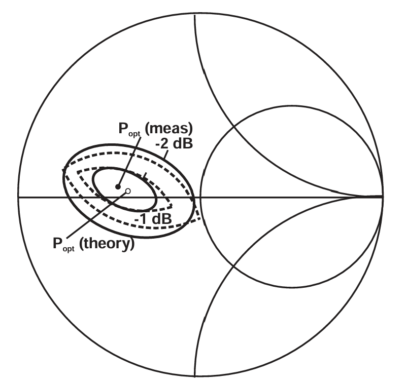 观察图 2.3 中的数据,可以得出最明显的结论是绘制在史密斯圆图上的等功率轮廓线并不是圆形的。与噪声圆或线性失配(增益)圆不同,它们无论设备如何精心校准,都不呈现圆形。多年来,人们把它们比作鸡蛋、土豆、橄榄球......但绝不是橙子或足球。过去一般认为这是非线性行为的表现,但有一个细节长期未被注意:即便将功率衡量标准换成最大线性功率(例如图 2.2 中的 A、A′ 点),这些轮廓的形状仍然大体保持一致。这暗示其非圆形的原因有更直接的解释,将在 2.5 节详细讨论。